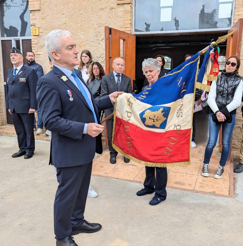 Deux jeunes porte-drapeaux reçurent des mains du général Gilles Glin et de François-Xavier Pujol de Salas, consul honoraire de Gérone, leur insigne et leur diplôme national de porte-drapeau délivrés par le ministère des Armées.
